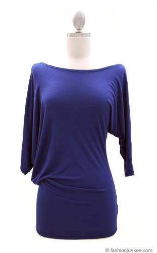 3/4 sleeve. Off the shoulder, assymetrical top. Soft jersey fabric. Draped loose fabric under one arm. Can be worn as an off the shoulder top or a boat neck top. Fitted waist (no band at the waist).