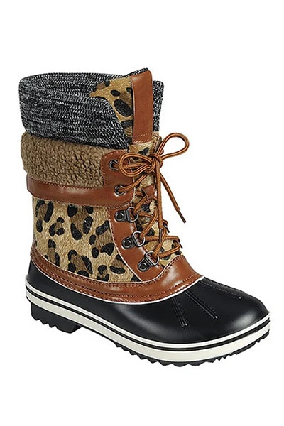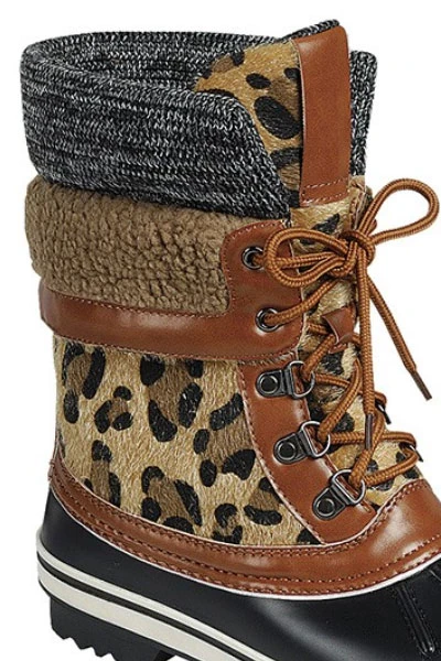 These unique snow boots will have have you looking stylish this winter! A gorgeous mix of colors and textures. Beautiful leopard print combined with sherpa fur, knit, faux leather trim and a rubber sole. Lace up design for a perfect fit. Waterproof upper. Durable rubber outsole.
