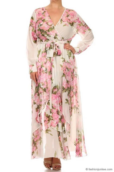 Long maxi dress. Gorgeous floral print adds a perfect touch to your spring look. Long sleeves. Crossover v-neck. Ties at the waist for a cinched flattering shape. Sheer chiffon fabric. Partial lining. This flowy maxi dress is the dramatic look you’ve been looking for!