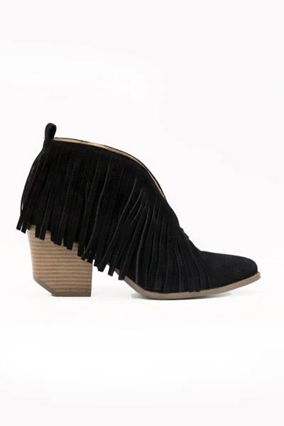 Faux suede booties. Unique v-shape at the top of the booties with fringe