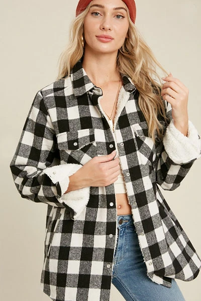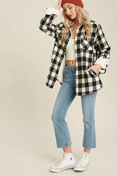 Be the first to review “Buffalo Plaid Sherpa Lined Shirt Jacket-Black And White” Cancel reply
