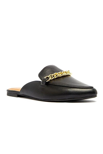 Pointy toe slides. Casual flat mules with an accent chain across the top. Closed toe. Open slip on back. An effortless but chic accessory to any outfit!