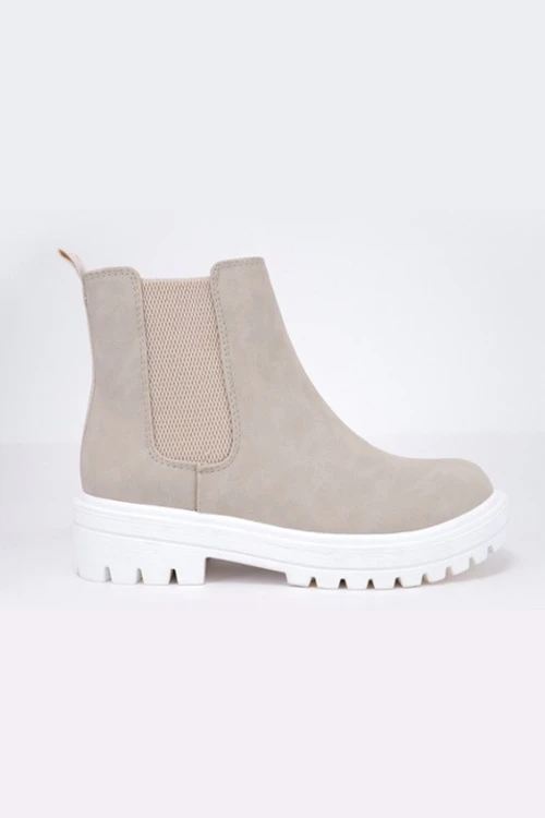 The classic chelsea boot gets a lifted edge with a lug sole. Edgy and classic. Contrasting white sole. Elastic side paneling makes these easy to slip on.Â