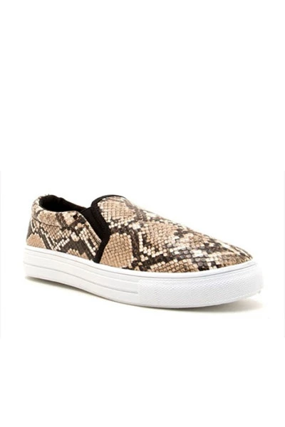 Casual slip on shoes. Unique brown snake print design adds a little flair to your outfit. Contrasting white sole. Comfortable and super easy to throw on and run around, without sacrificing style.