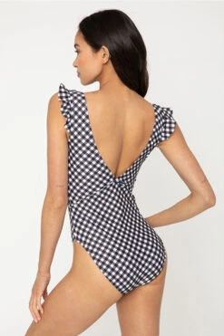 Low Cut One Piece V-Neck Swimsuit With Ruffle Sleeves-Gingham Black