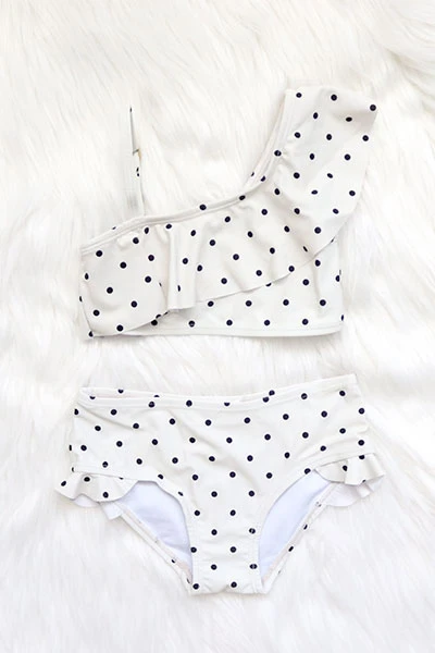 Be the first to review “Kids Polka Dot Two Piece Ruffle One Shoulder Swimsuit-Off White & Black” Cancel reply