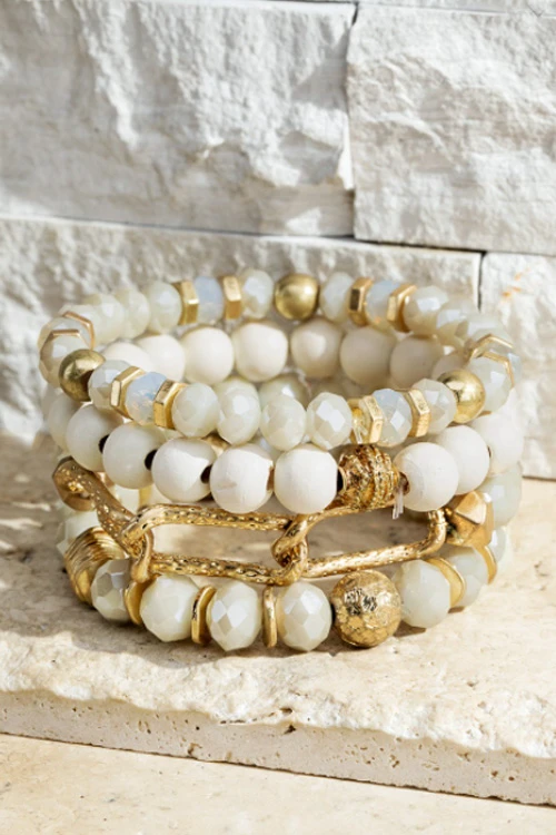 Set of four mixed bead and chain bracelets. Gorgeous combination of wood and stone beads bracelets and a chain link bracelet.