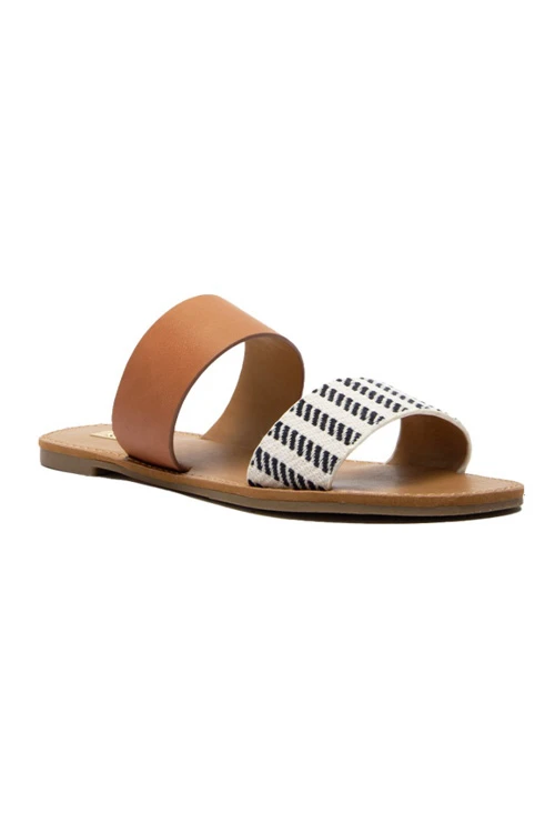A basic and chic pair of sandals that can be worn every day! Two bands across the top. A fun mix of colors – one solid strap and striped strap made of knit canvas material. Open Toe. Flat Sole.