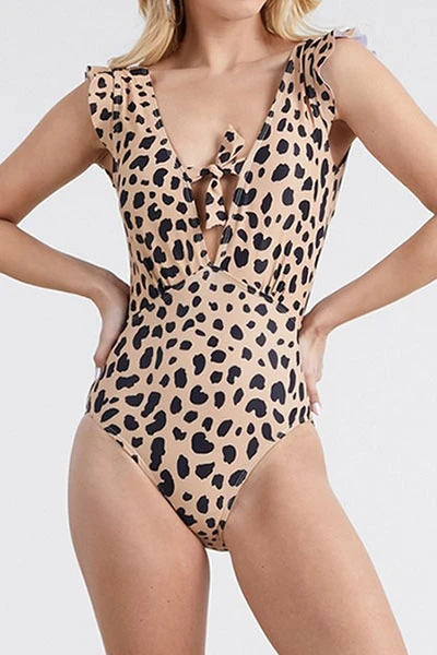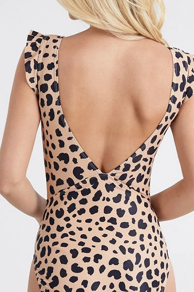 bust. Ruffle detail at the shoulders. V-cut open low back. Gorgeous leopard print design. This one