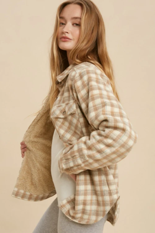 Plaid shacket. Super soft sherpa lining. Button down front. Long sleeves. Two chest pockets and side pockets. Wear it alone as a plaid shirt or layer it as a jacket.