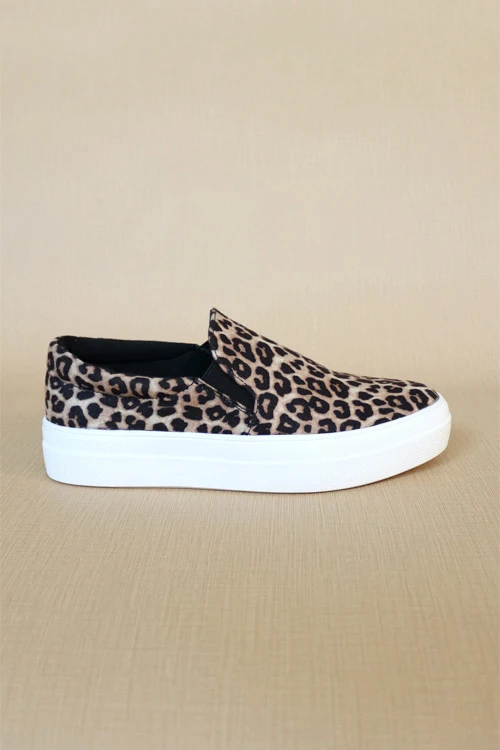 Casual slip on shoes. Platform sole end unique animal print adds a little fun to any outfit! Contrasting white sole.