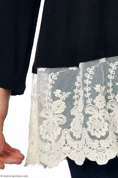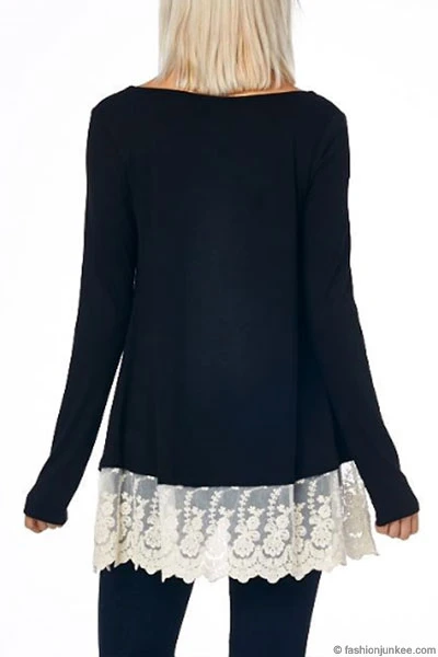 Jersey long sleeve top. The perfect basic top with added flair at the bottom. Lace detailing at the bottom hem. Loose fit. A super comfy tunic for any occasion. Soft jersey fabric. Layer it with a stylish scarf and you’ll look polished and put together for the day!