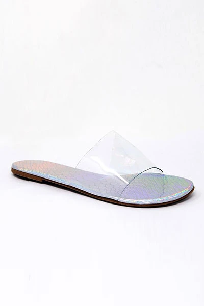 Single band sandals. Clear band with a fun silver hologram sole. The perfect basic slides with just a little extra detail to make