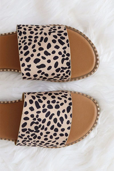Single band sandals. Solid band with gold trim along the border of the sole. Leopard print band across the top. The perfect basic slides with just a little extra detail to make these stand out! Soft cushioned sole. Effortless and comfortable. Grab a pair of these affordable must have sandals – we promise you’ll be wearing them all season!