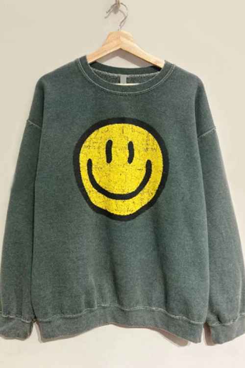 SMILE!…This is the cutest smiley face sweater EVER! Crew neck sweatshirt featuring bright smiley face in the center. Yellow smiley face with black outlines. Mineral wash for gorgeous vintage look. Long sleeves. Gorgeous lavender color.