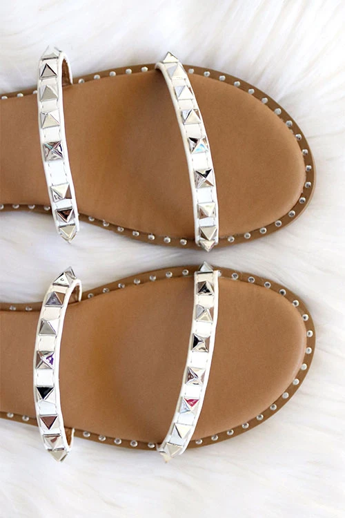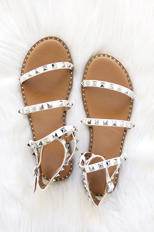 It’s all in the details! These fun strappy sandals have everything you’ll ever need in a sandal. Three strap design. Ankle strap with buckle closure for a flexible fit. White straps with gorgeous studded detail. Silver trim along the border of the sole. Silver studs and hardware.