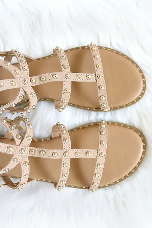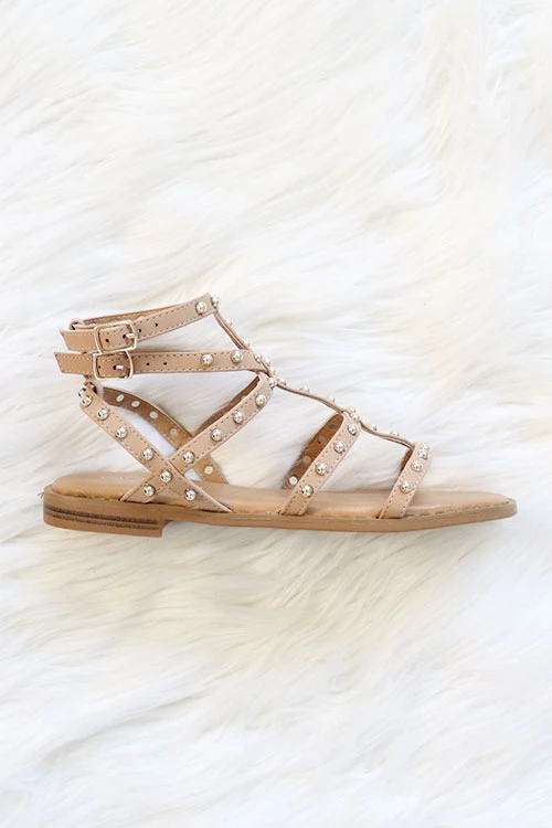 buckle closure for a flexible fit. Taupe straps with gorgeous studded