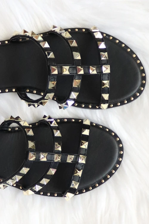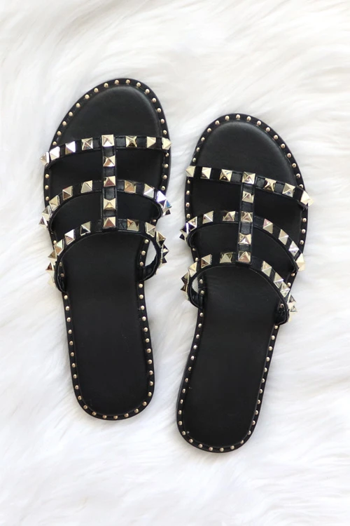 It’s all in the details! These fun strappy sandals have everything you’ll ever need in a sandal. Three strap design with a vertical strap. Black straps with gorgeous studded detail. Slip on style. Round studded trim along the border of the sole.