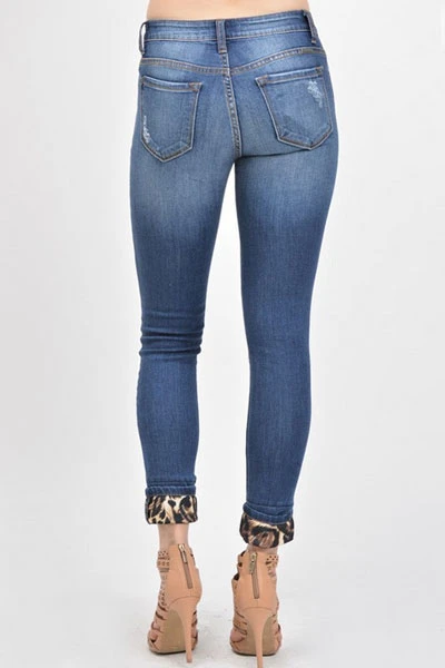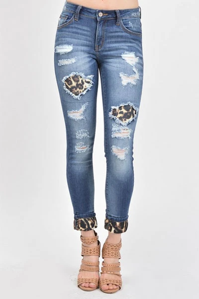 Give your outfit a little attitude! Ripped boyfriend jeans. Distressed cutouts that reveal a leopard print fabric underneath. Cuffed at the bottom with matching leopard print fabric at the underside of the cuff. Mid-rise. Stretch material hugs the body perfectly to show off all your curves. Destroyed, ripped denim fabric. 4 pocket design with two back pockets. Zipper closure. Now comes in plus size too!