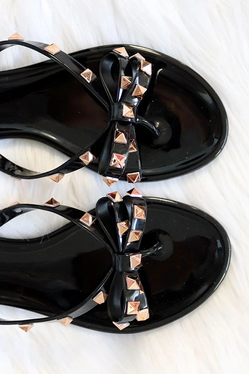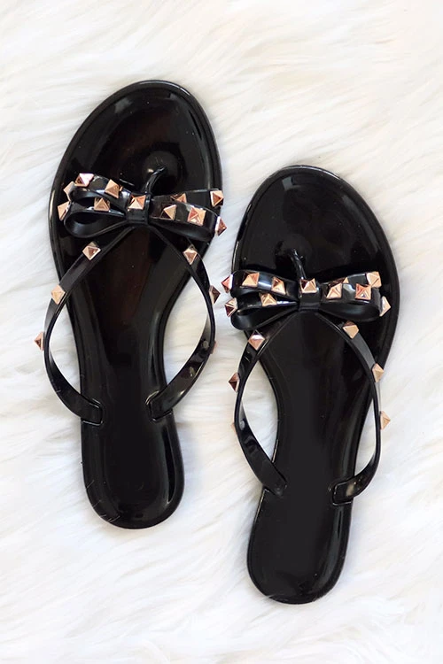 Casual and chic flip flop sandals. Jelly material. Adorable bow detail. Studded accent along the straps and bow. These fun, casual shoes will compliment any outfit. Pair it with t-shirt and jeans, or cut off shorts for an effortlessly chic look. Or dress it up with a cute summer dress. Goes well with anything!