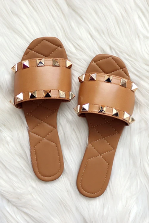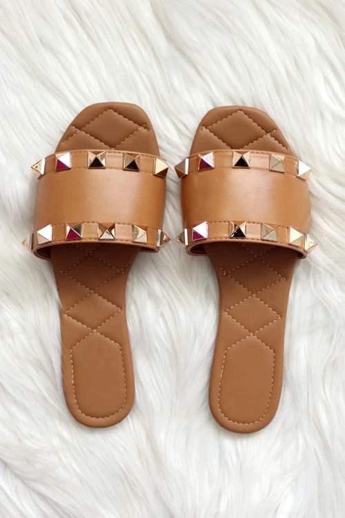 Single band sandals. Stylish studded detail at the top and bottom border of the band. The perfect pair of sandals with just a little extra detail to make these stand out! Effortless and comfortable.Â