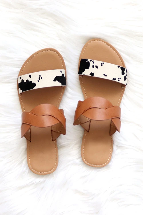 Twisted two band sandals. Two bands across the top. One solid band that is beautifully braided, and one band in a fun animal print. Open Toe. Flat Sole.