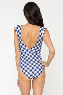 Low Cut One Piece V-Neck Swimsuit With Ruffle Sleeves-Gingham Print Blue